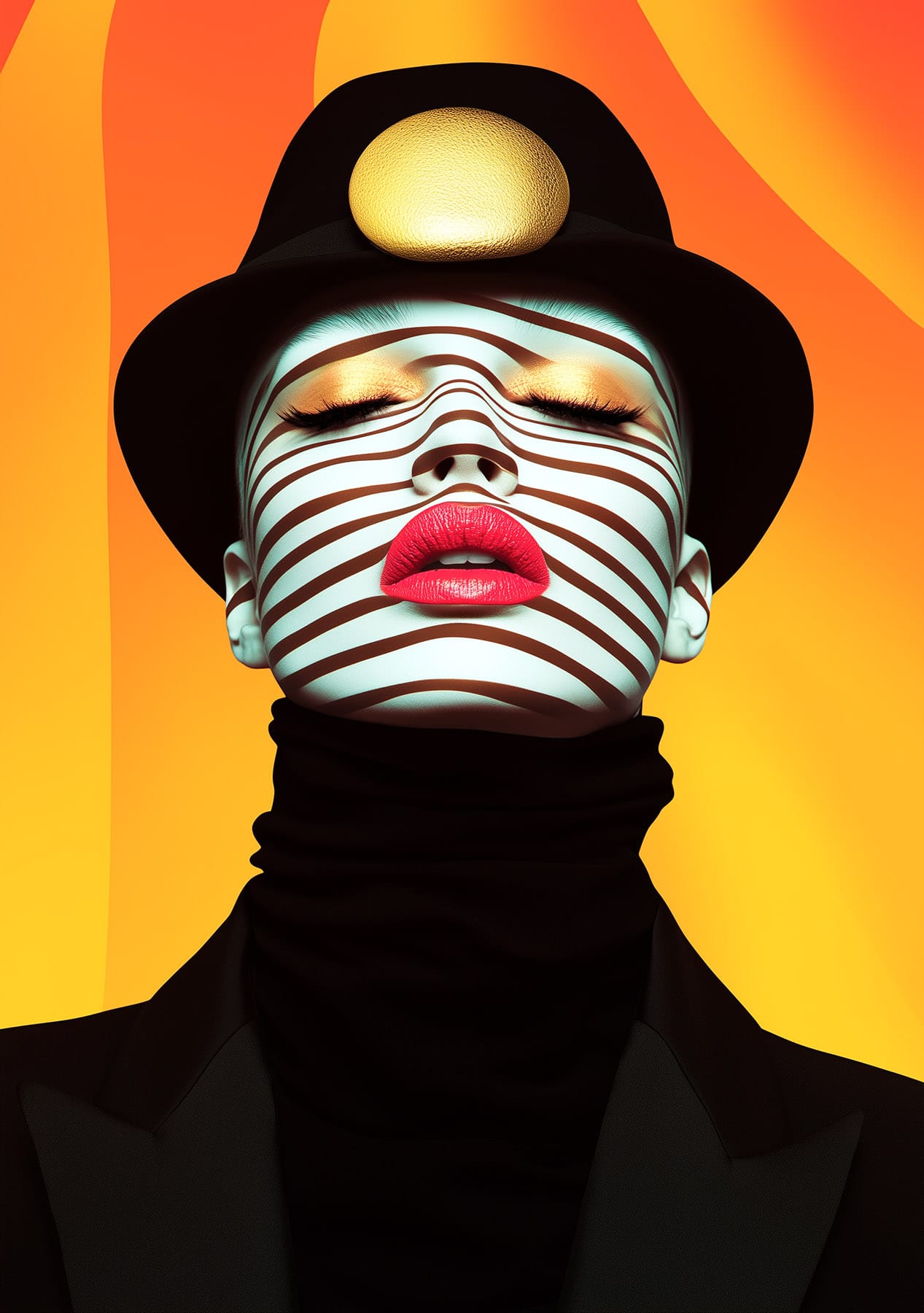 Step into a world of optical illusion, bold contrasts, and surreal beauty with this striking portrait. A fusion of Op Art, surrealism, and modern concept art, this piece captivates with its interplay of bold stripes, vibrant colors, and dramatic lighting. The enigmatic figure, adorned with a structured hat and wrapped in mesmerizing patterns, evokes a sense of mystery and futuristic elegance.